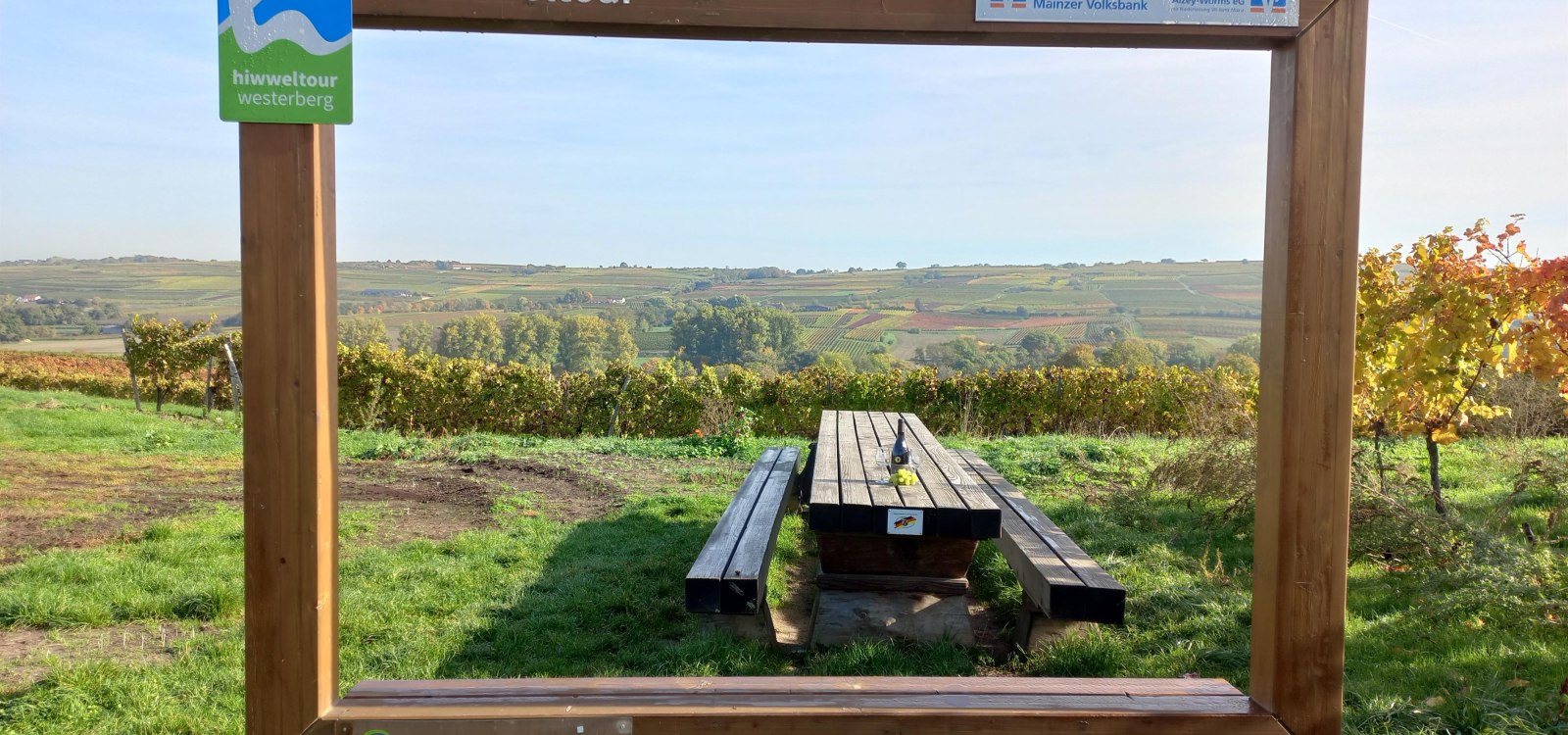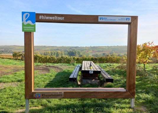 Inmitten der Ingelheimer Weinberge steht dieser Tisch des Weines direkt an der Hiwweltour Westerberg.