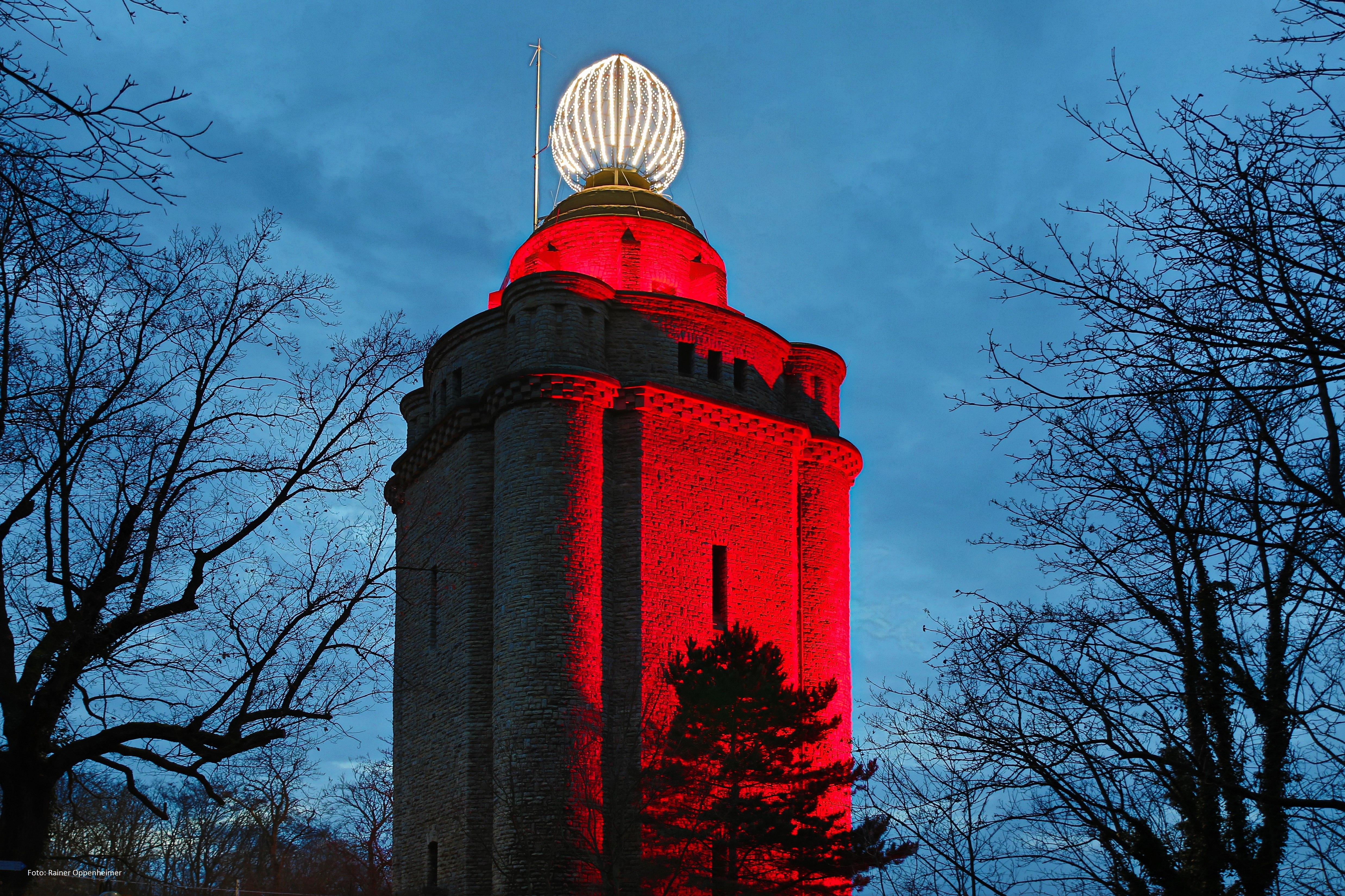 Al meer dan 20 jaar straalt de Bismarcktoren in de aanloop naar Kerstmis als een grote adventskaars boven Ingelheim en ver in het Rijndal – een lichtend symbool van de stad in het donkere seizoen. De Rheinhessische Energie- und Wasserversorgungs-GmbH zet zich ook in 2025 weer sterk in voor dit identiteitsbepalende adventslicht van contemplatieve aard.