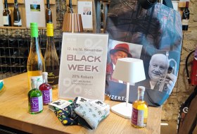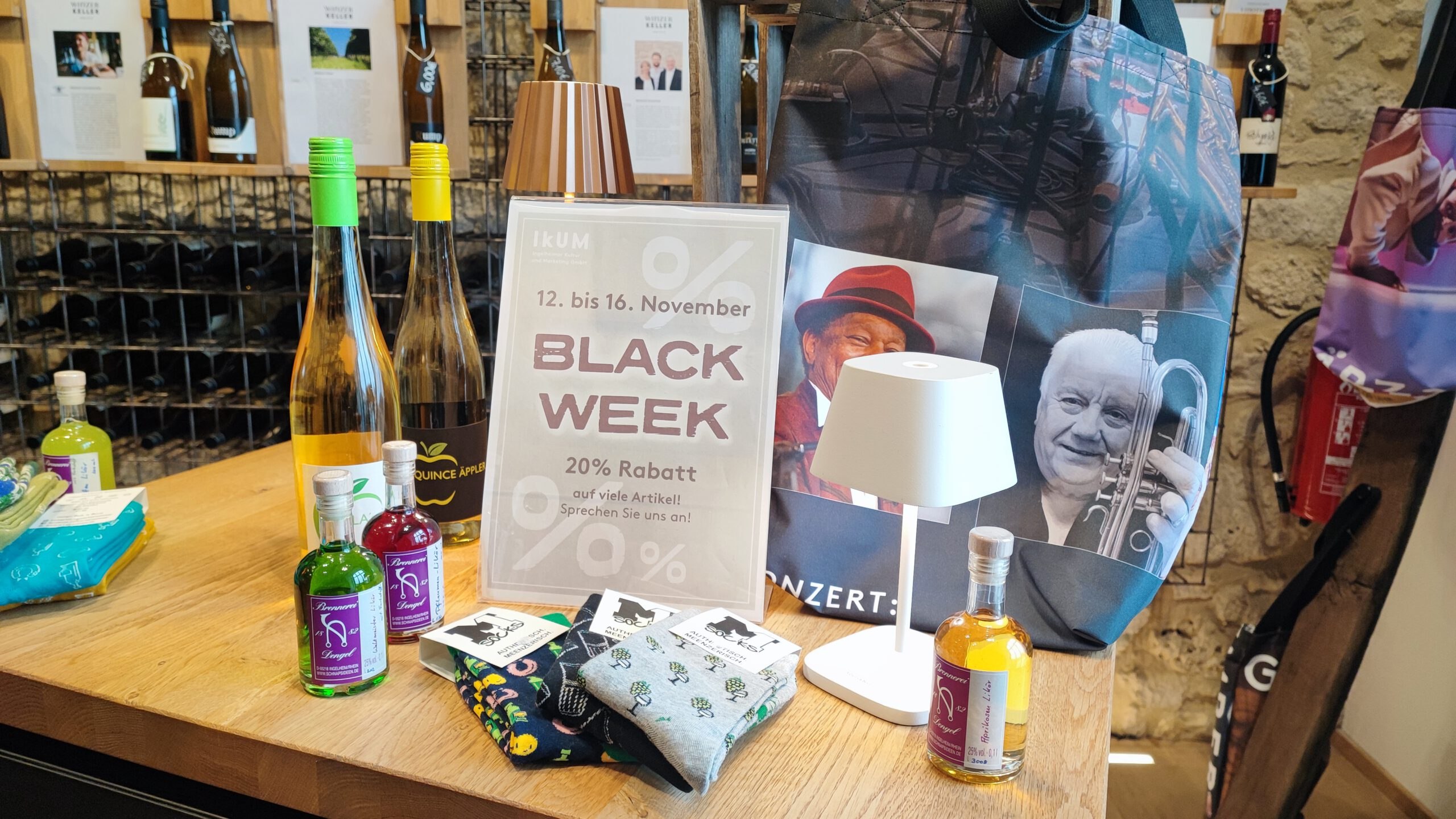 De “Zwarte Week korting” geldt onder andere voor likeur- en schnapsminiaturen, appelsap en cider en verlichtingsproducten. Je kunt ook een koopje doen bij het kopen van de stijlvolle upcycling shoppers of de kleurrijke sokken met “Weck, Worscht und Woi” motieven. Het vermakelijke wijnkwartet met 58 speelkaarten met interessante weetjes over druivensoorten en teeltregio's en originele receptsuggesties is ook afgeprijsd.