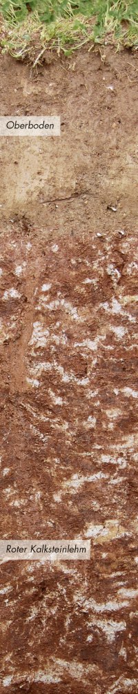 Tiefgründiger ziegelroter, kalkhaltiger, toniger Lehmboden, gute Wasserspeicherfähigkeit, ausreichende Durchlüftung, gute Nährstoffversorgung, kalkhaltig, ausreichende Durchwurzelbarkeit, mittlere Erwärmbarkeit