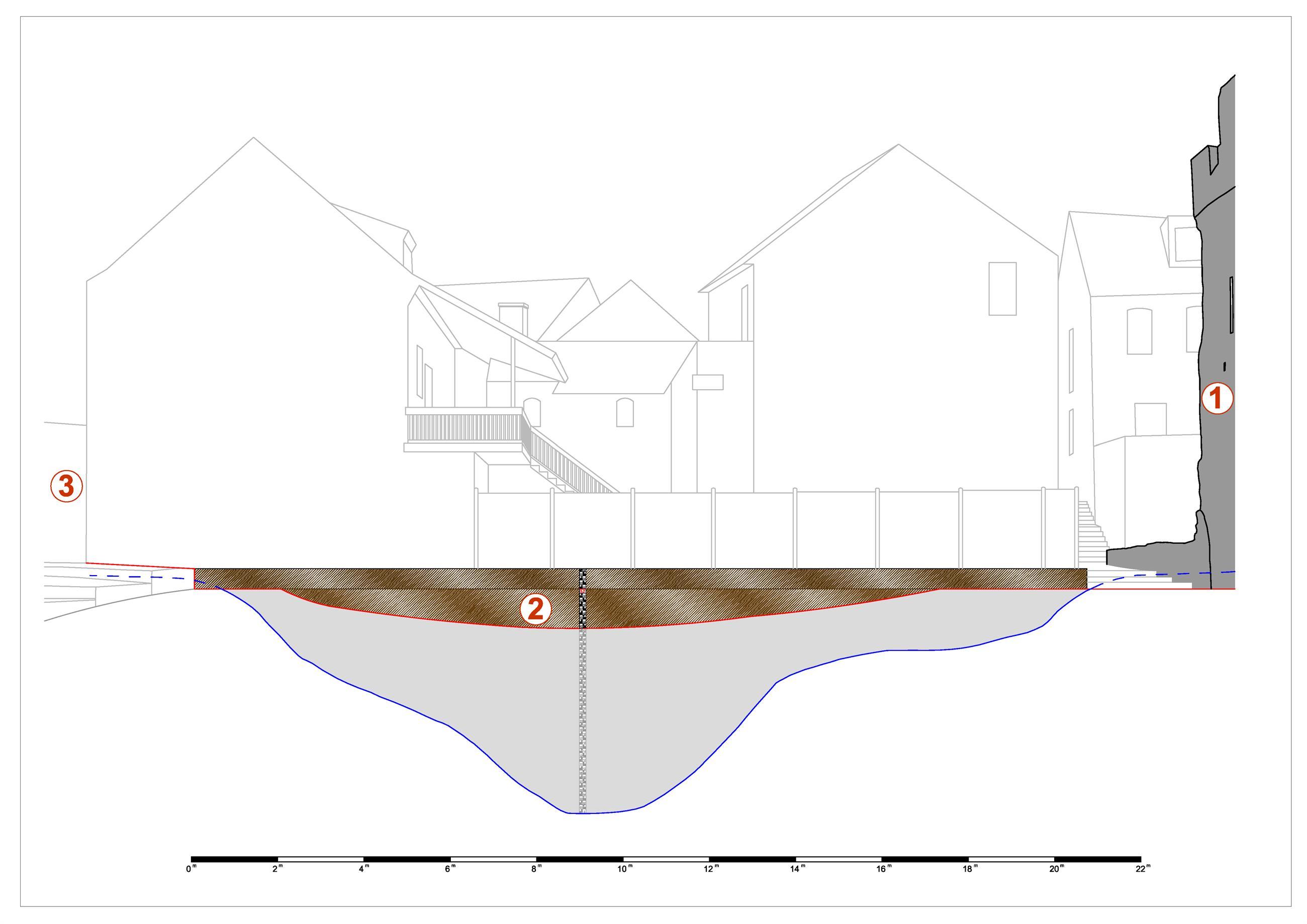 An der Außenseite des Halbkreisbaus ist der Verlauf eines ehemaligen Wassergrabens aus dem 12. Jahrhundert zu erkennen. Dieser wurde im Zuge der